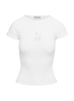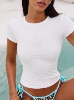 - Rhinestone design, bikini detail, round neckline, cap sleeves