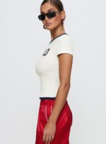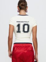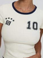 - Contrast trim detail, graphic print front & back, brand name feature, number 10 detail, round neckline, cap sleeves